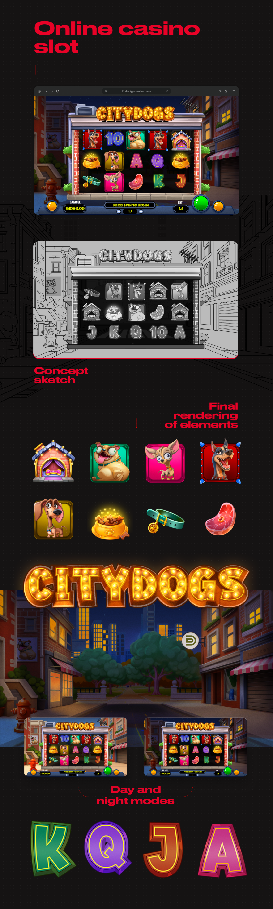 CityDogs is a 5×3 online slot game developed for a client in the iGaming industry. PWPlay handled the complete creative production, from initial concept and sketches to final rendering, animation, and sound design.